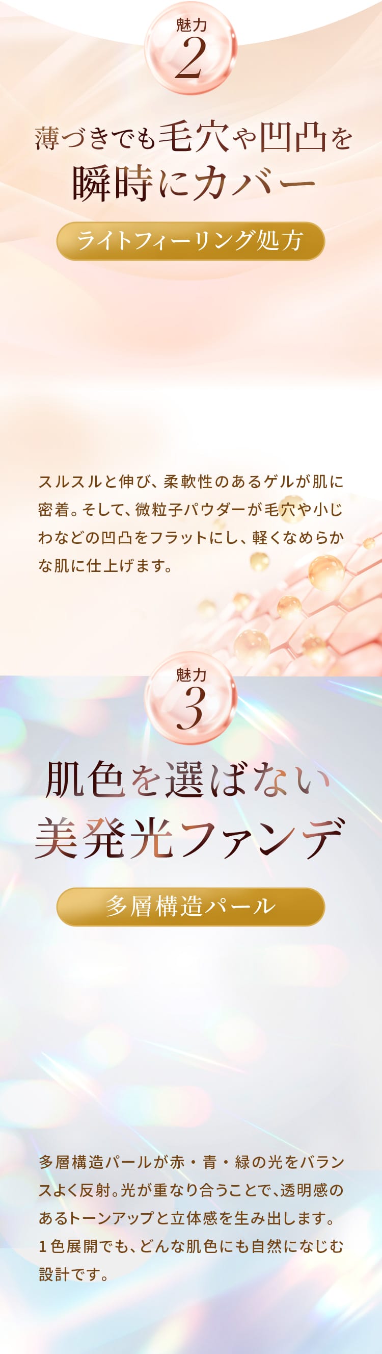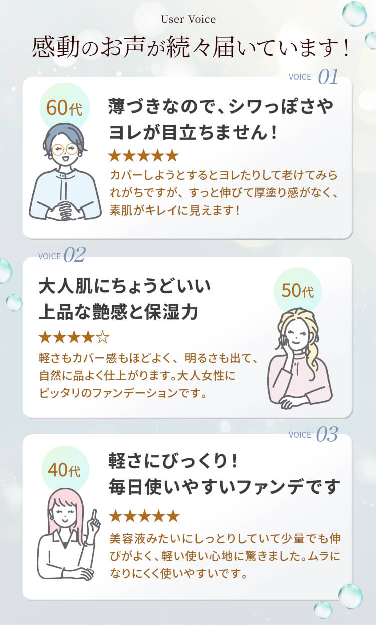 のばした瞬間、スルスルと溶けるようになじんで驚きました。厚塗り感が出ず、自然なツヤ肌に仕上がります。「素肌がきれい」に見せたい時にぴったりのファンデでした。