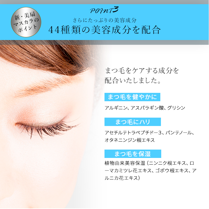 美扇マスカラ。スルスルと重ね付けがしやすく、毛先までダマ知らずな美しい扇まつ毛に!